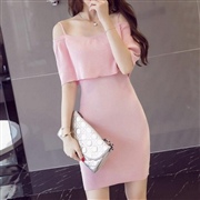 葉邊露肩吊帶背心針織包臀 [連身裙] #1-粉紅色...