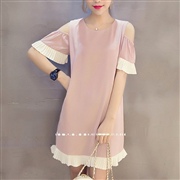 拼色露肩圓領短袖連身裙 [連身裙] #1-粉色 #...