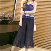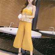 帶蕾絲拼色上衣+雪紡闊腿褲 [套裝] #1-黃色 ...