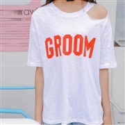 母印花露肩短袖上衣上衣 [上衣] #1-紅色字母 ...