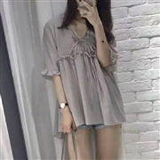 綁帶花邊袖皺褶娃娃衫上衣 [上衣] #1-白色 #...