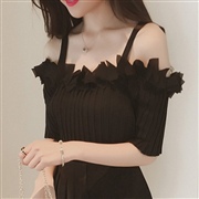 一字肩上衣百褶短袖雪紡衫 [上衣] #1-白色 #...