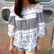 一字領圖案燈籠袖襯衫 [上衣]