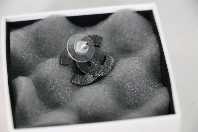 (SOLD)CHANEL A43735 黑色圓形綴銀色閃石CC Logo 耳環