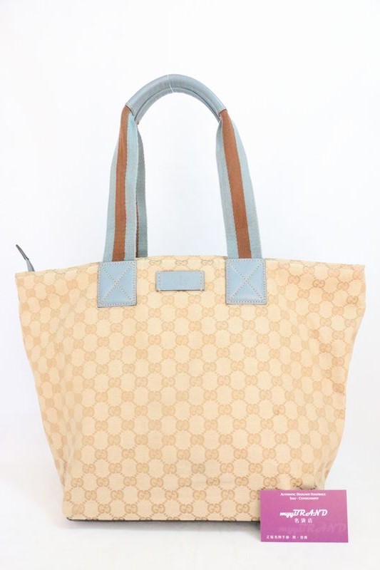 (SOLD)GUCCI 131231 杏色 帆布 配藍色 皮革 購物袋 肩背袋 手袋