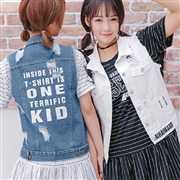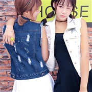 印花破洞牛仔馬甲背心 [外套] [牛仔褸] #1-白色 #2-藍色