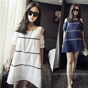 露肩條紋拼接連身裙 [連身裙] #1-白色 #2-紅色 #3-藍色