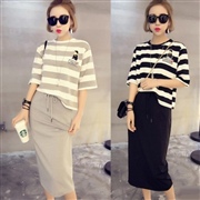 條紋套裝圓領五分袖 [套裝] #1-灰色 #2-黑色