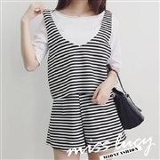 短袖上衣+條紋背心+高腰短褲 [套裝] #1-白色 #2-黑色
