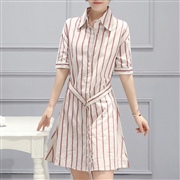 條紋腰帶排扣顯瘦連身裙 [套裝]